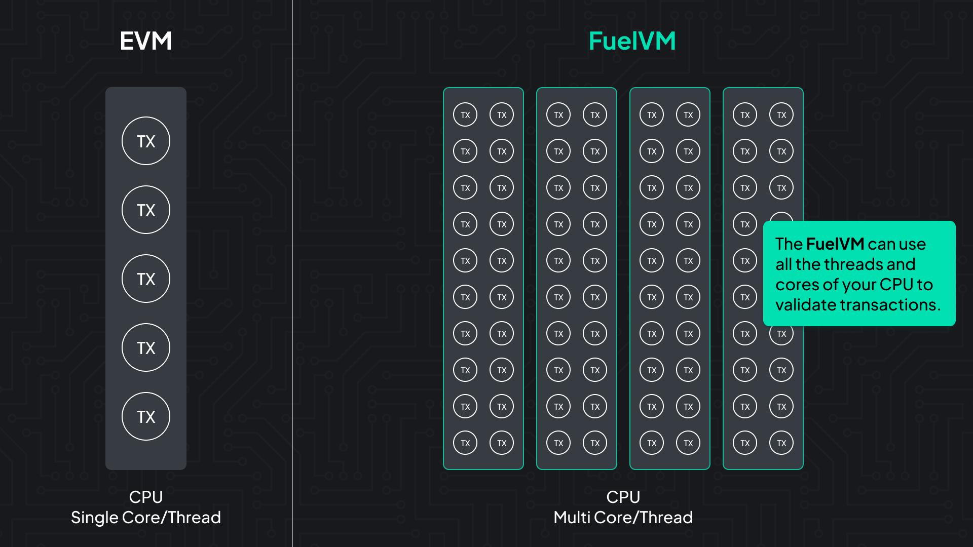 Fuel brings scale to Ethereum without sacrificing decentralization.The FuelVM is designed to reduce wasteful processing of traditional blockchain virtual machine architectures, while vastly increasing the potential design space for developers. The FuelVM can use all the threads and cores of your CPU to validate transactions.
